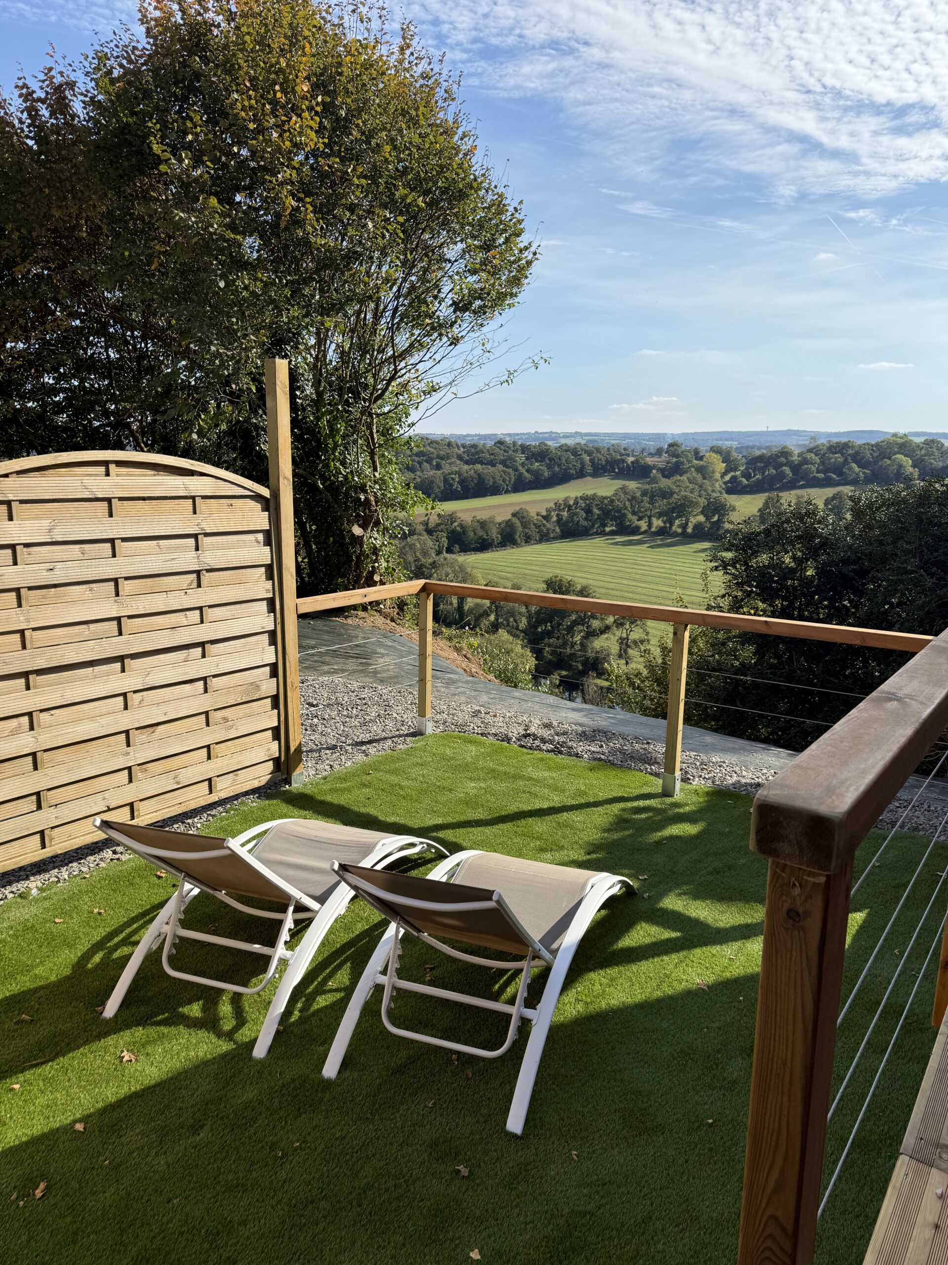 La cabane de Chamade est exposée plein Sud, d’accès de plain-pied avec terrasse suspendue au-dessus de la vallée, mais c’est de son lit, face à la verrière, à l’étage que vous pourrez le mieux admirer l’exceptionnel panorama dont elle jouit ! La forêt s’étend à ses pieds jusqu’à la rivière que l’on devine à travers les branches des arbres, 60 mètres plus bas !