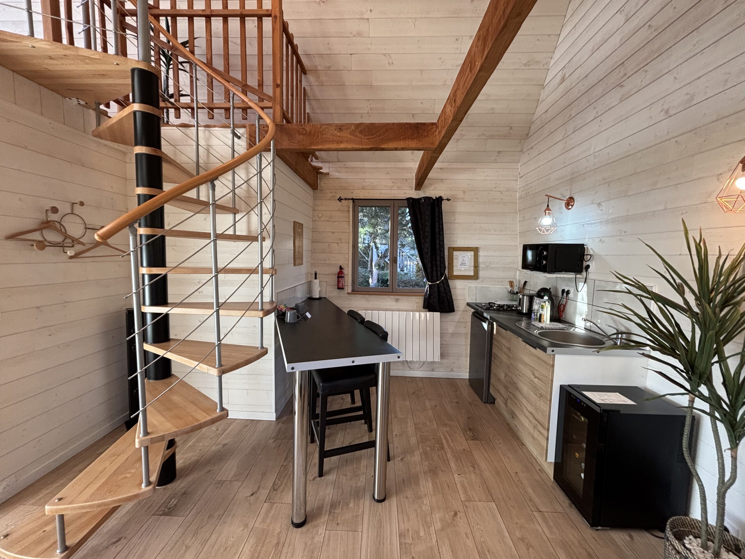 Il s’agit d’une cabane en duplex, avec un étage accessible par un escalier en colimaçon.