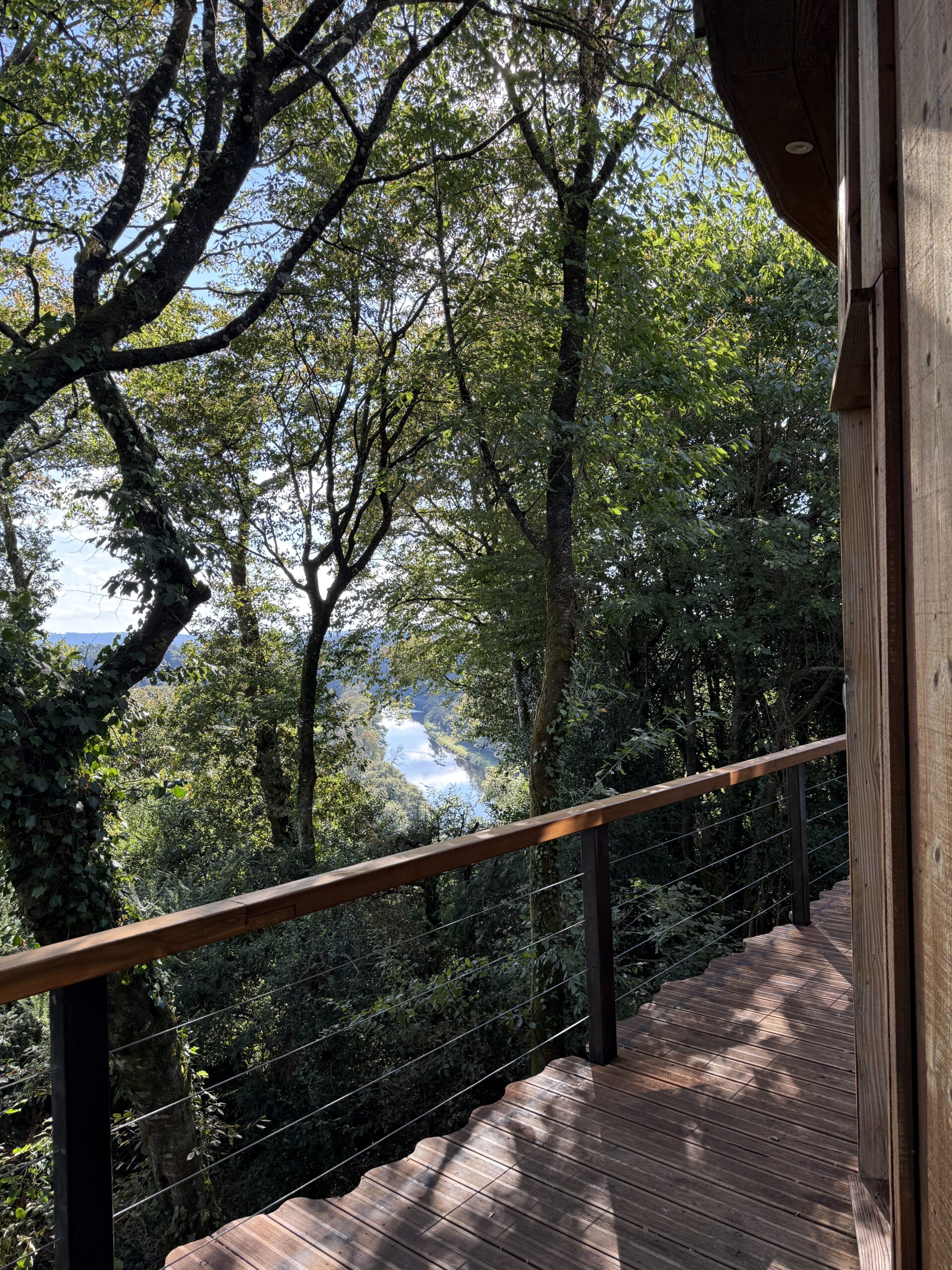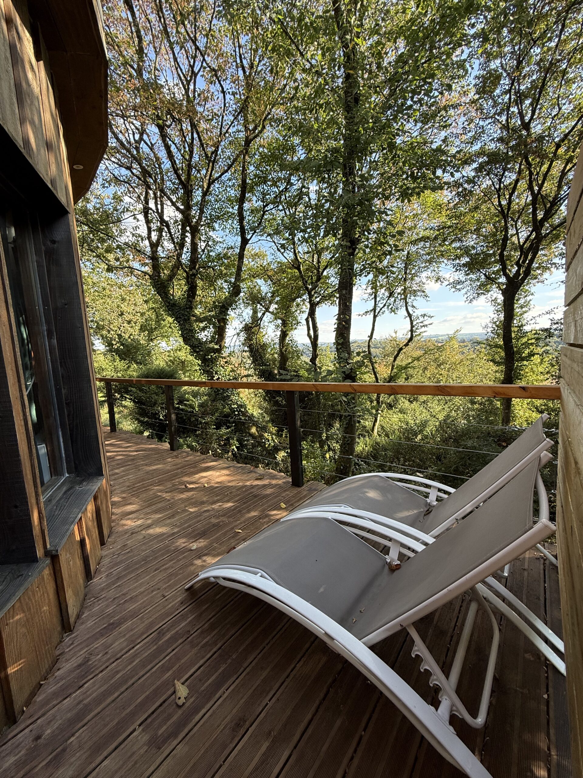 Le plus de la cabane de Qalipso est sa grande terrasse complètement nichée dans les arbres. un endroit unique pour profiter de la nature environnante et de la vue sur le Canal de Nantes à Brest. Si vous avez de la chance, vous aurez peut-être la visite des écureuils qui ont élu domicile dans les bois environnants.