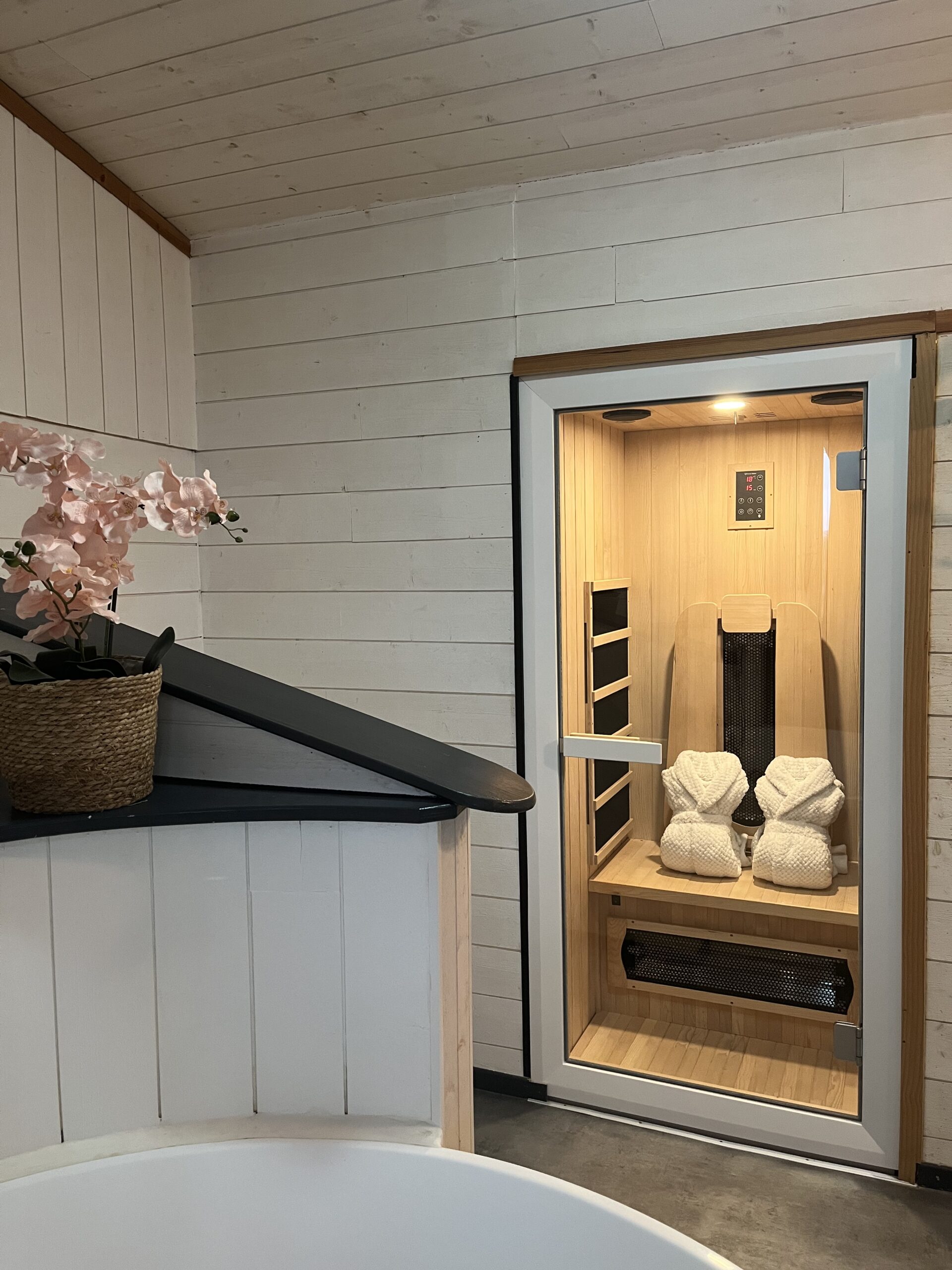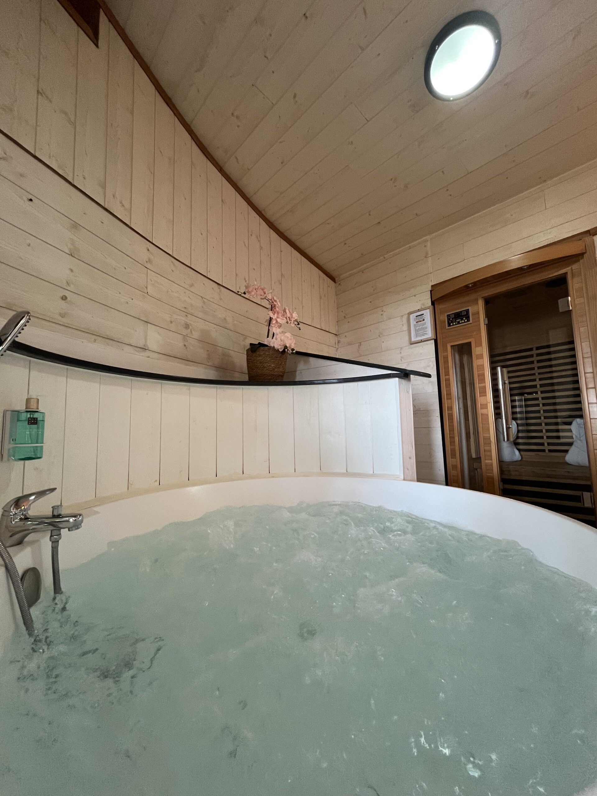 Intimiste, luxueusement équipée : bain à remous 2 places, cabine de sauna japonais, c’est l’assurance d’une escale bien-être dans un havre de paix.