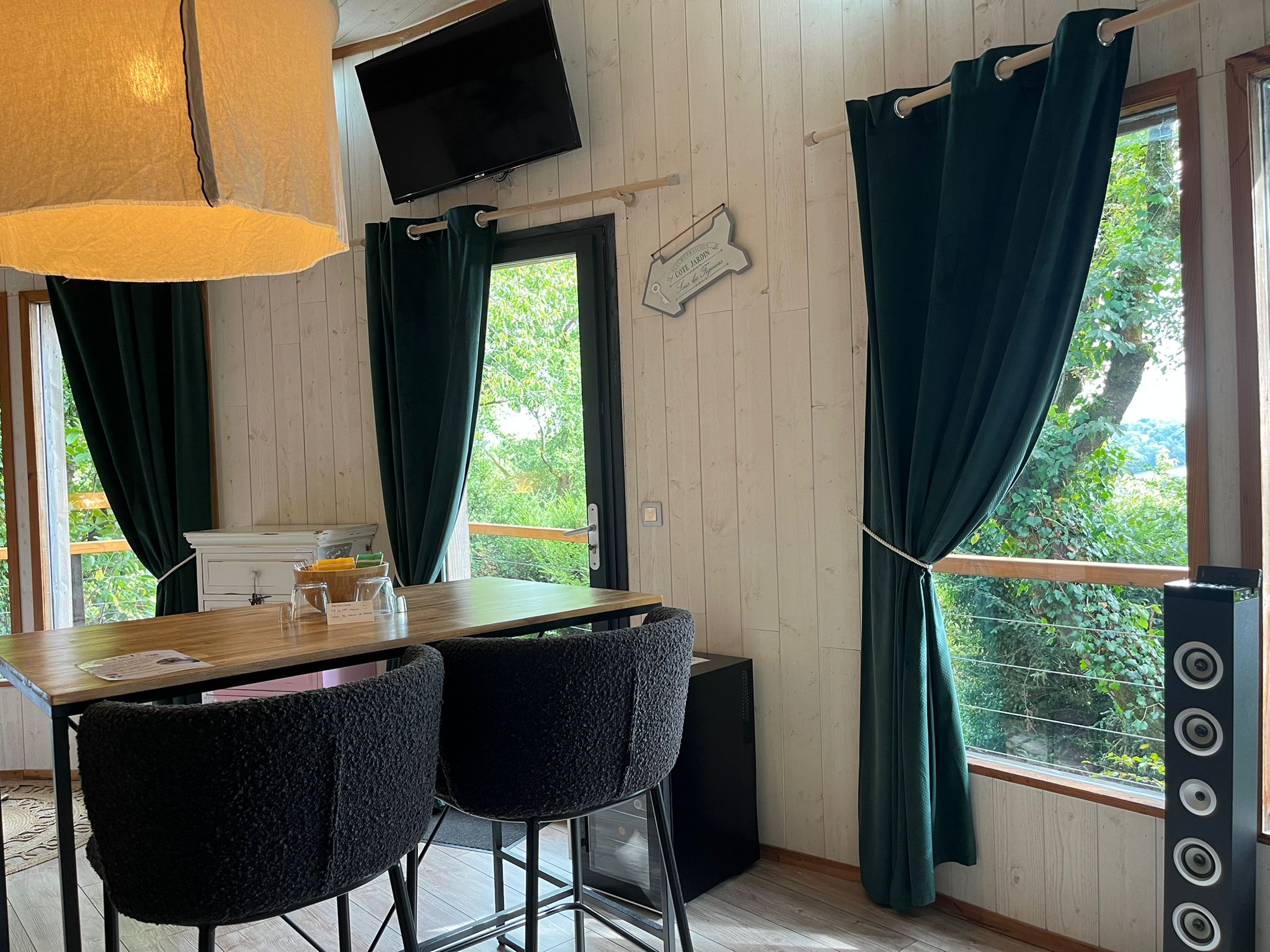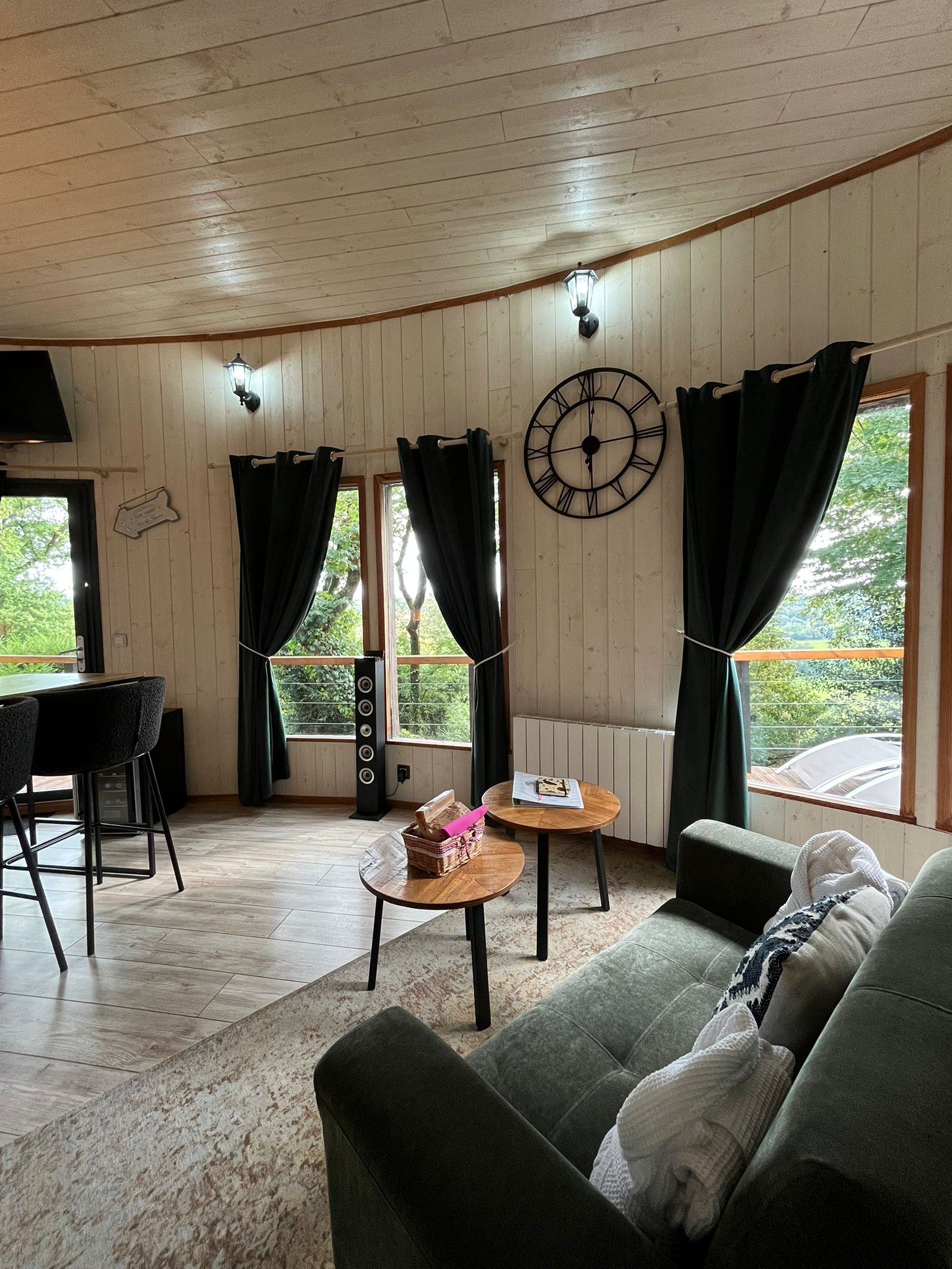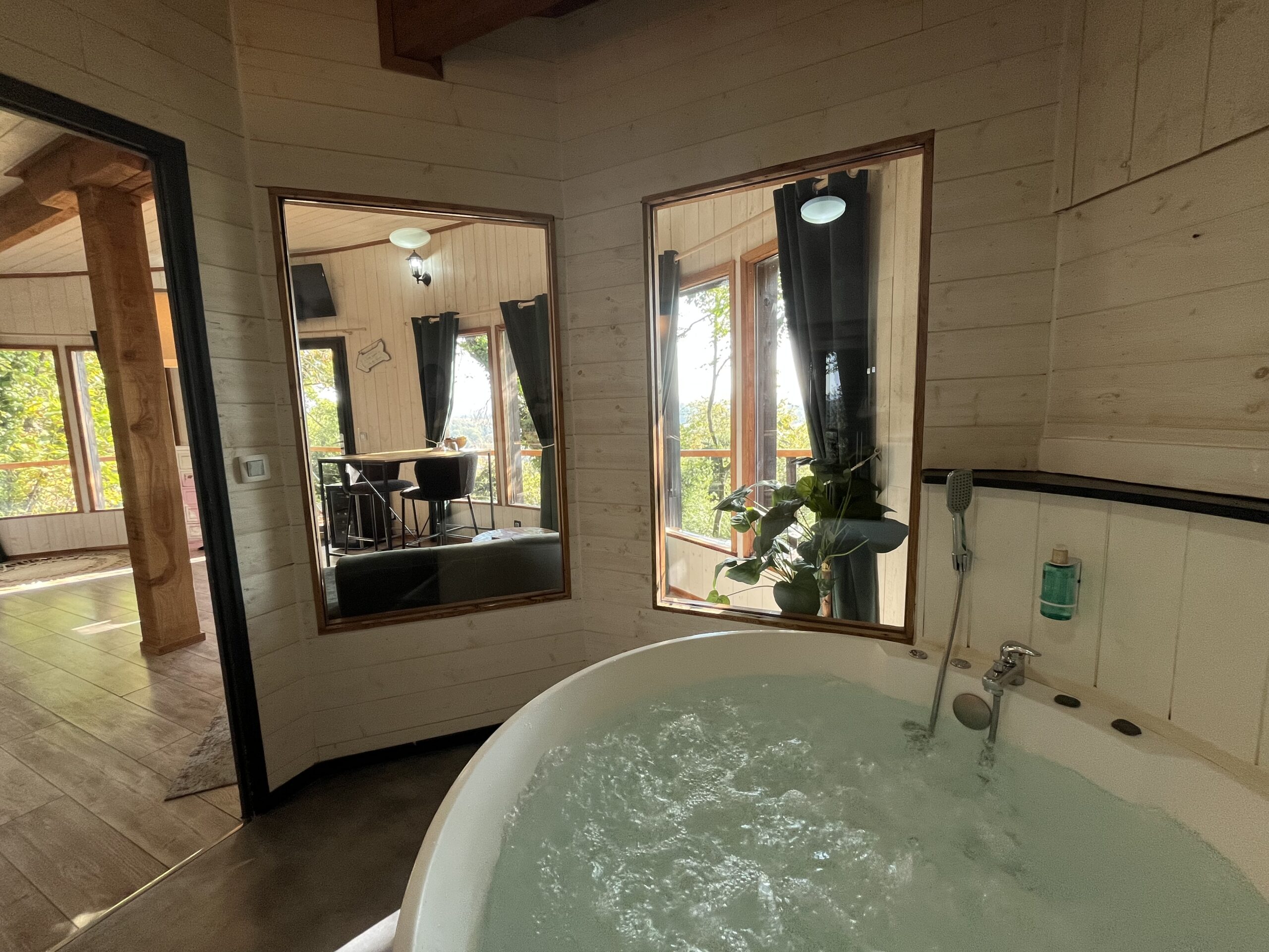 La cabane spa de Qalipso vous attend, pour une pause à deux, complètement nichée entre les arbres de la forêt. Sa forme en demi-lune entièrement vitrée, offre une vue panoramique sur la canopée qui descend jusqu’à la rivière, 60 mètres plus bas.