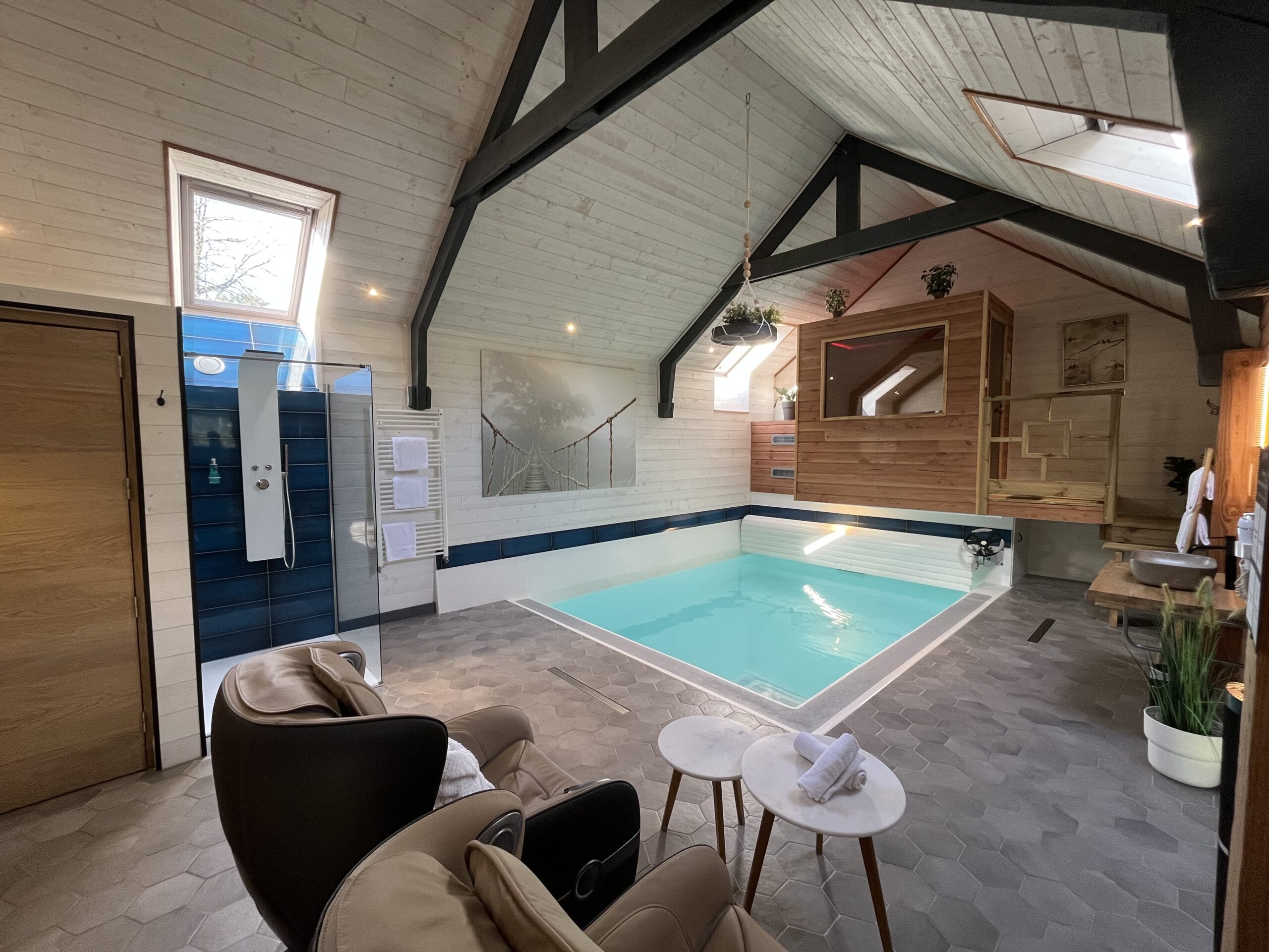 Ambiance nature dans l’espace bien être : piscine chauffée à 31 °, sauna, lavabo, WC séparés, coin salon pour des moments de détente absolue en toute intimité.