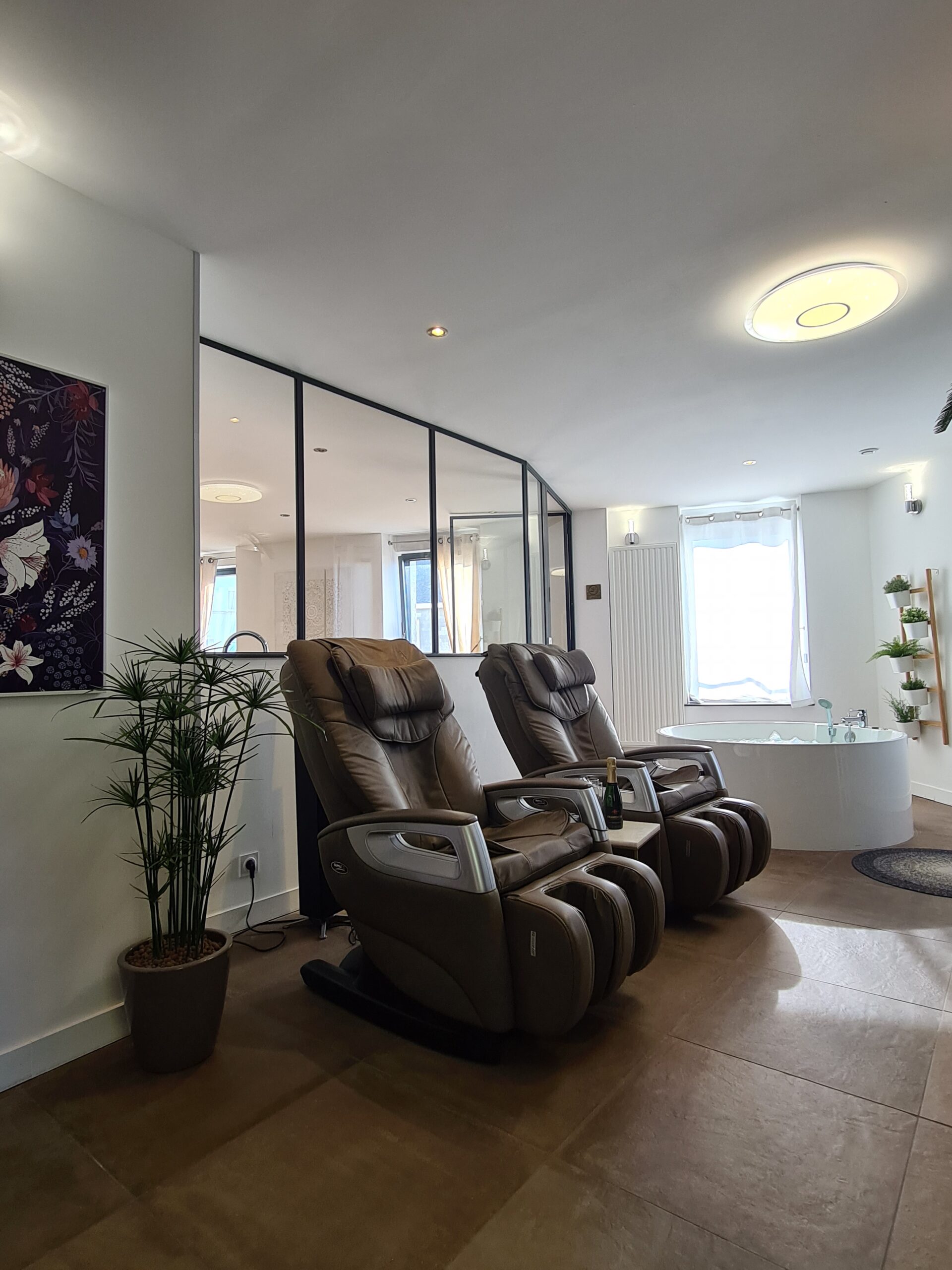 Appréciez la tranquillité et l’intimité de votre espace bien-être entièrement privatisé. Prélassez vous dans le grand bain à remous et profitez des produits d’hygiène Rituals. Votre espace bien-être est également équipé d’un sauna et d’un hammam reconnus pour leur vertu apaisante. Tout est réuni pour vous faire passer un moment d’exception hors du temps en couple.