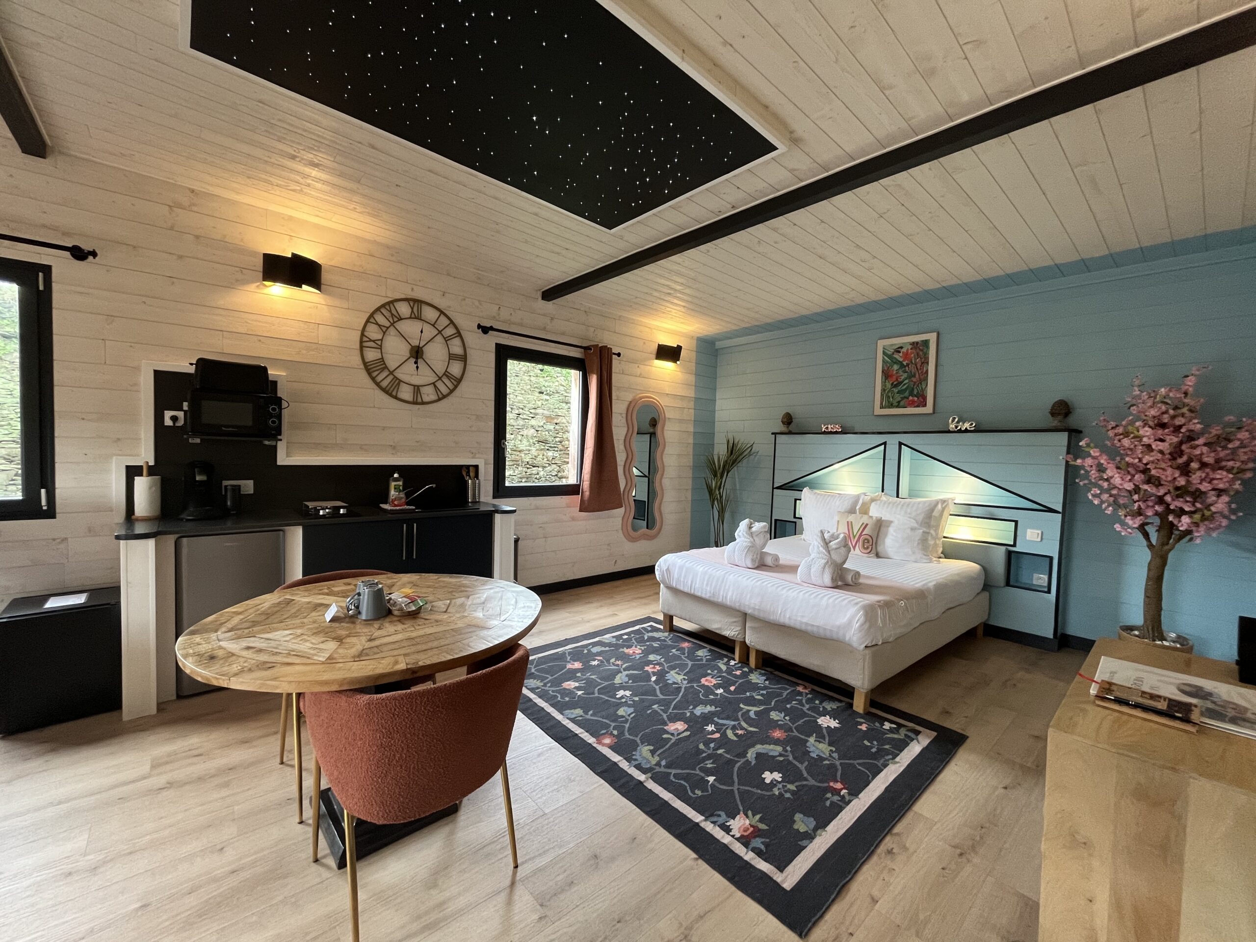 Dans sa pièce de vie, une kitchenette est présente pour vous permettre de cuisiner comme bon vous semble. Par ailleurs, un minibar est à votre disposition vous laissant le choix de profiter d’une collation : soda, champagne, jus de fruit… voir même des crêpes apéritives et une tablette de chocolat ! Le lit se trouve face à la terrasse.