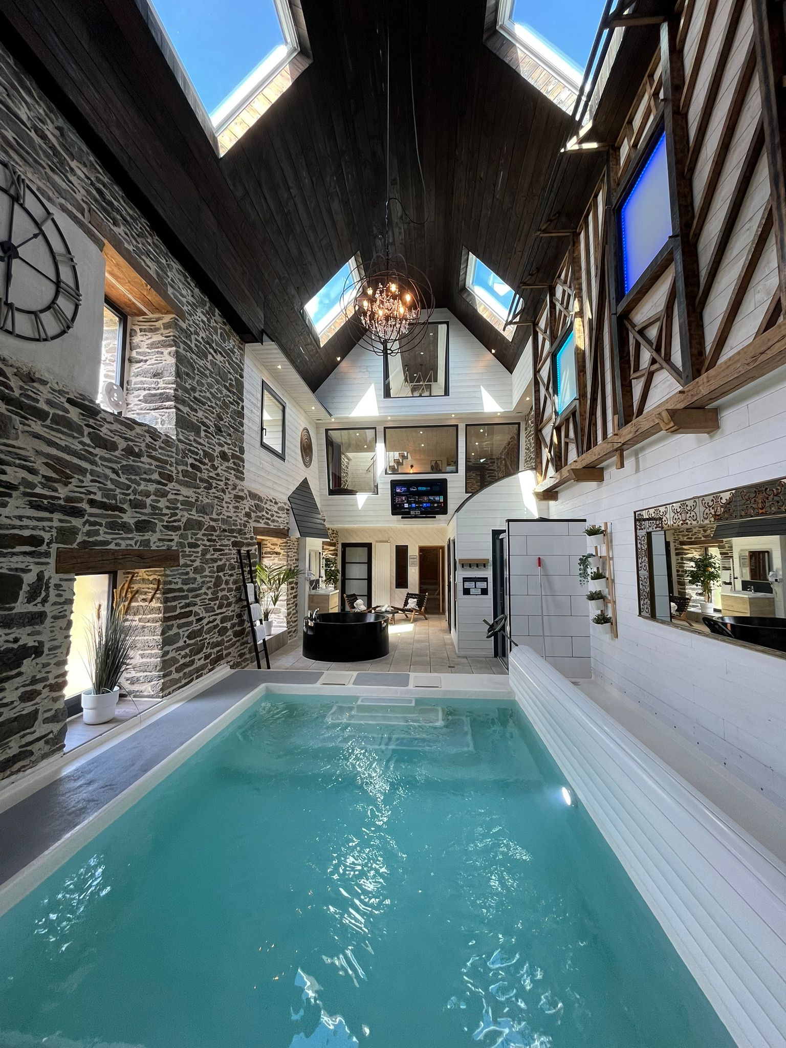 Rendez-vous dans un lieu de relaxation avec une bâtisse en pierre et un plafond cathédrale parfait pour capturer vos meilleures photos de votre séjour insolite en Bretagne. Dans cette pièce, vous pourrez profiter pleinement de votre temps de repos et de votre escapade en amoureux grâce à sa piscine privative, son bain à remous et son sauna finlandais. Relaxez-vous dans le bain à remous avec une petite flûte de champagne et savourez un instant privilégié en compagnie de votre partenaire. Entraînez-vous dans votre monde grâce à votre musique préférée tout en vous baignant dans une piscine paradisiaque.